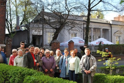 Zwiedzający na tle willi dawnych właścicieli fabryki fortepianów i pianin Fibigerów.