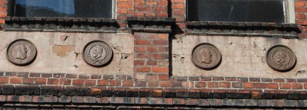 Na elewacji fabryki fortepianów zachowały się medale zdobywane za instrumenty w czasach carskich.