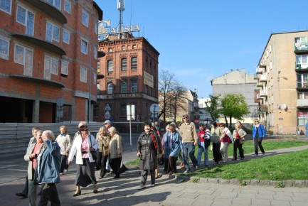 Grupa z przewodnikiem Stefanem Szymczakiem na ulicy 3 Maja gdzie w latach dwudziestych XX wieku zbudowano dwie szkoły podstawowe.